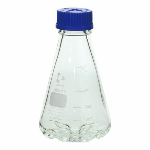 ねじ口振盪三角フラスコ(下部バッフル付)500ml (1個)ねじ口振盪三角フラスコ(下部バッフル付)500ml (1個)。バッフルが底面にある構造の振盪フラスコです。ねじ口メンブレンキャップ付きのため、オートクレーブの際にキャップを緩める必要がありません(キャップ耐熱温度140℃)。容量(mL):500口内径×外径×高さ(mm):30×105×180ネジ口規格:GL-45材質:本体/硼珪酸ガラス-1、キャップ、液切リング/PPキャップ、液切リング付※キャップは高さに含まれません。コード番号:016460-500A。検索キーワード:4528602