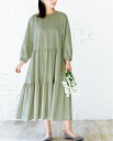 ティアードワンピース&ターバン(SB-0032) ・サイズ:M L LL ■参考材料用尺(左からM・L・LL) 〈表布〉107cm幅 5.1m、5.2m、5.4m 〈ゴムテープ〉2cm幅 70cm、70cm、70cm 〈ボタン〉直径1cm 1個、1個、1個 さらっと着るだけで決まるティアードワンピースは、裾に向かってふわりと広がるシルエットが魅力。落ち着いたライトカーキやおそろいの幅広ターバンが甘さをおさえてくれます。