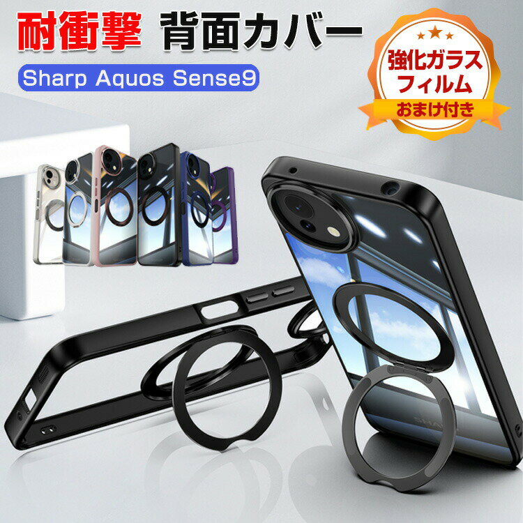 SHARP AQUOS sense9 ケース 耐衝撃 カバー タフで頑丈 TPU&PC素材 衝撃吸収 落下防止 360°回転しスタンド おしゃれ カッコいい 便利 実用 人気 衝撃に強い スマホ シャープ アクオス センス9 背面カバー 金属 クリアケース 保護ケース 強化ガラスフィルム おまけ付き