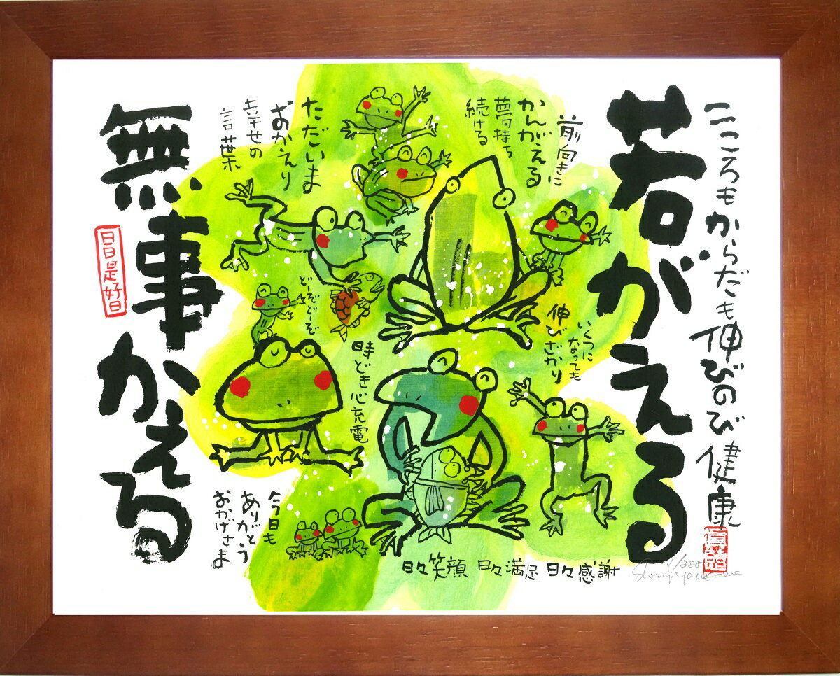 縁起物額装 安川眞慈 YSE-306 【無事かえる】 カエル 縁起物 ジグレー版画 招福 開運 Shinji Yasukawa 送料無料 431×340mm かえる 蛙 開運アート 絵画 額入り