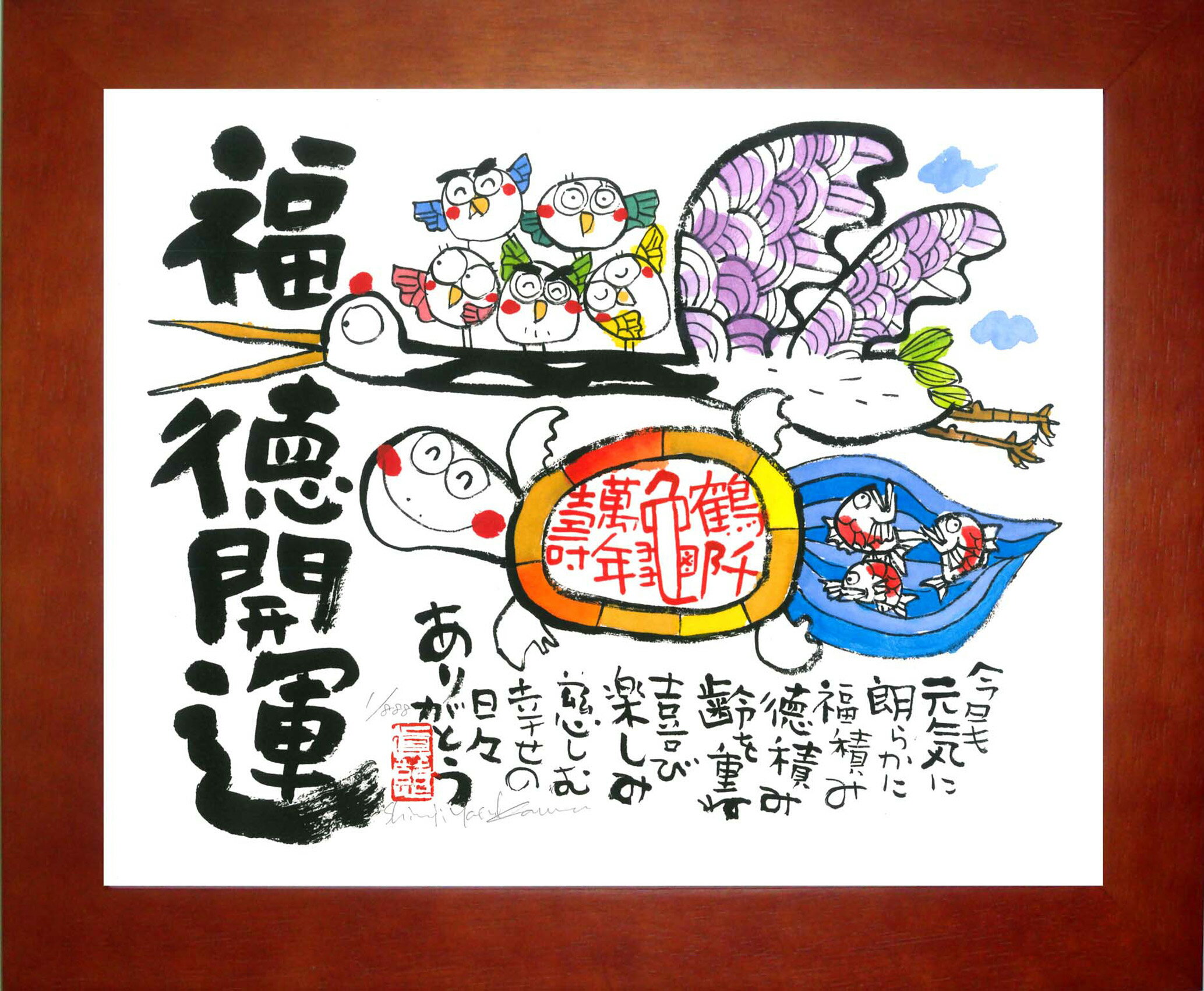縁起物額装 安川眞慈 YSE-009 【福徳開運】 鶴 亀 鯛 縁起 パワー 福 幸せ 縁起物 ジグレー版画 招福 開運 Shinji Yasukawa 送料無料 355×295mm 開運アート 絵画