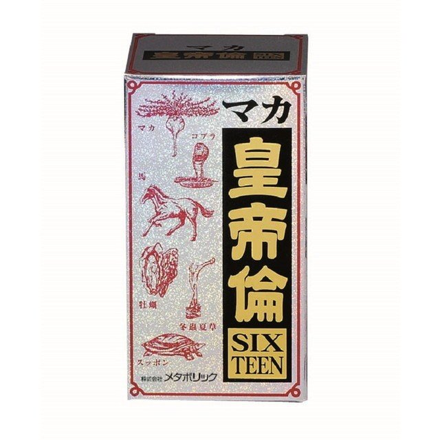 【商品特長】 ●「マカ皇帝倫SIXTEEN」は、男性のためのパワー成分、南米原産の植物「マカ」を主成分とし た商品です。 ●マカの他に、スタミナ成分スッポン、牡蠣肉エキス、L−アルギニン、馬心臓、冬蟲夏草、タツノオトシゴ、トナカイ角、コブラ、亜鉛、セレン、カフェイ ン、ニンニク、ショウガ、トウガラシ、ナイアシンの15成分を加え、計16成分を配合しています。 ●若々しく逞しい男性を目指す方のサプリメントです。 【原材料名】 スッポン、牡蠣肉エキス、マカエキス、醸造酵母、ニンニク、ショウガエキス、トウガラシ、冬蟲夏 草、馬心臓、タツノオトシゴ、トナカイ角、コブラ、L−アルギニン、結晶セルロース、乳糖、デキストリン、ショ糖エステル、カフェイン(抽出物)、微粒酸 化ケイ素、レシチン(大豆)、セラック、香料、V.C、ナイアシンアミド、V.E、パントテン酸Ca、V.B1、V.B6、V.A、葉酸、V.D、 V.B12 【主な成分】(10粒当たり) マカエキス末 250mg、スッポン粉末 300mg、 冬蟲夏草末 50mg、牡蠣肉エキス末 300mg、馬心臓粉末 50mg、L−アルギニン 500mg、カフェイン 100mg 【栄養成分】(10粒当 たり) エネルギー 11.4kcal、たんぱく質 1.62g、脂質 0.17g、炭水化物 0.86g、ナトリウム 1〜20mg、ナイアシン 1.2mg、亜鉛 15mg、セレン 50μg 【お召し上がり方】 栄養補助食品として、1日10粒程度を目安に、2〜3回 に分けてたっぷりの水またはぬるま湯と一緒にかまずにお召し上がりください。 販売元:株式会社メタボリック 電話:03-5367-3131 広告文責:有限会社シンエイ