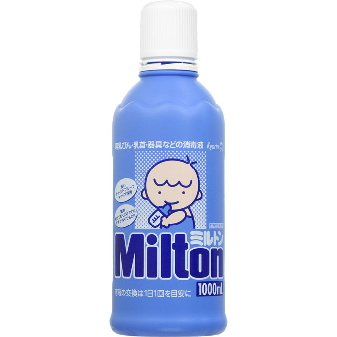 使用上の注意●相談すること1.本剤をあやまって飲みこんだ時は、すぐに水、生卵、ミルク等を飲み、医師に相談してください。2.目に入らないように注意してください。目に入った場合には、こすらずにすぐに水又はぬるま湯で十分に洗い流してください。なお、症状が重い場合には、眼科医に相談してください。3.ミルトン溶液との接触により、手の荒れ、発疹・発赤、かゆみ等の症状があらわれ場合には使用を中止し、医師又は薬剤師に相談してください。効能・効果次の消毒・殺菌哺乳びん、乳首、手指、皮膚、ガーゼ、包帯、衛生器具、器具等用法・用量●哺乳びん、乳首・・・約80倍にうすめ、1時間以上浸す。●手指、皮ふ・・・約20倍にうすめて用いる。●ガーゼ、包帯、衛生器具等・・・約10-50倍にうすめ、15分以上浸す。●器具等・・・約80倍にうすめ、1時間以上又は約10-50倍にうすめ、15分以上浸す。*用法及び用量に関連する注意1.定められた用法・用量を厳守してください。2.ミルトン タブレットやシアヌール酸系の製品、酸性の洗浄・漂白剤等との混合は危険ですので避けてください。3.金属製の容器は用いないでください。また、哺乳びんバサミ・スプ-ン等の金属製品や、指輪等貴金属をミルトン溶液につけることも避けてください。メラミン食器等には、本剤の使用を避けてください。4.調整後、ミルトン溶液が変色した場合、その水での調整を避けてください。成分・分量次亜塩素酸ナトリウム・・・1.1w/v%保管および取扱い上の注意1.直射日光の当たらない湿気の少ない涼しい所に密栓して保管してください。2.他の容器に入れ替えないでください。(誤用の原因になったり品質が変わる)3.衣類等につくと脱色、変色することがありますので注意してください。4.殺菌消毒する製品によっては印刷面(文字、絵)、材質などが変色・変質することがあります。ミルトンによる消毒法1.洗浄する哺乳びんや乳首などは、よく洗います。2.溶液を調製する水で約80倍に薄めて溶液をつくります。※24時間を目安に交換してください。3.浸けるよく洗った哺乳びんや乳首などを浸けます。※1時間以上で消毒できます。4.調乳する取り出して、溶液をよく振り切って使います。※残液やにおいが気になる場合はすすいでご使用ください。発売元杏林製薬広告文責株式会社 村源019-623-1211お客様のご注文確認後に、【発送にお時間を頂く商品】【リニューアル品・製造中止品】の確認を致しまして 弊社より、ご連絡を差し上げる場合がございます。ご了承くださいませ。