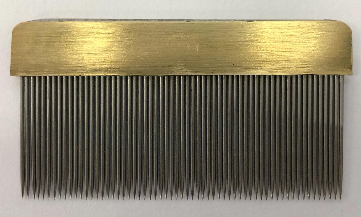 金ぐし コーム 16K-560 全巾62mmx一番長い箇所34mm(針の長さ19mm・一番長い箇所)(針の長さ15mm・一番短い箇所)(0.8mmφ)(針の数60本)ドイツ製の金ぐし。すべて手作りで毛玉を取ったり起毛したり修正時に大変便利。持ち手部分は真鍮製で針部分はニッケルメッキ。世界中のプロが愛用する逸品を是非お試しください。 ※ご注文の数量やタイミングによっては入荷までお待ち頂く場合がございます。 ※配送・お支払方法等の詳細はコチラをクリックしてください。
