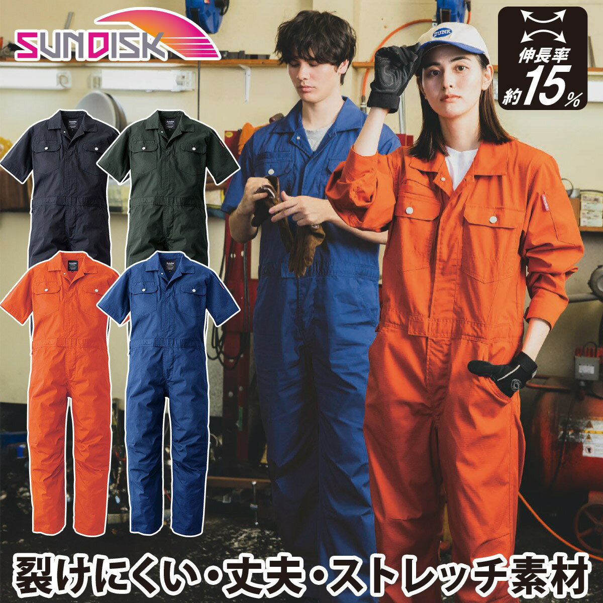 サンディスク SUNDISK 半袖ツナギ SD8310 S〜3L ストレッチリップストップ 伸縮率約15% クライミングカット 春夏 続服 つなぎ 作業服 作業着 男女兼用 ユニセックス 日の丸繊維