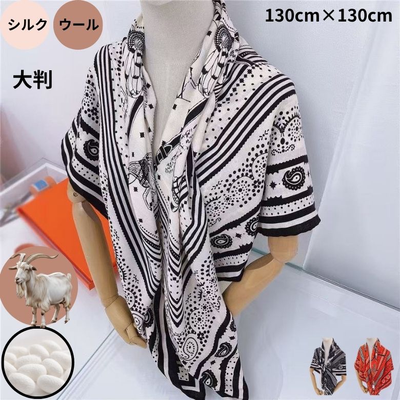 ウールシルク レディース 大人 ストール スカーフ おしゃれ ペイズリ柄 モノトーン バイカラー バンダナ柄 上質 高級 大判ストール 大判スカーフ エレガント ウール シルクスカーフ 母の日 ギフト プレゼント 誕生日 メンズ 海辺 旅行 トラベル Horse scarf Cashmere