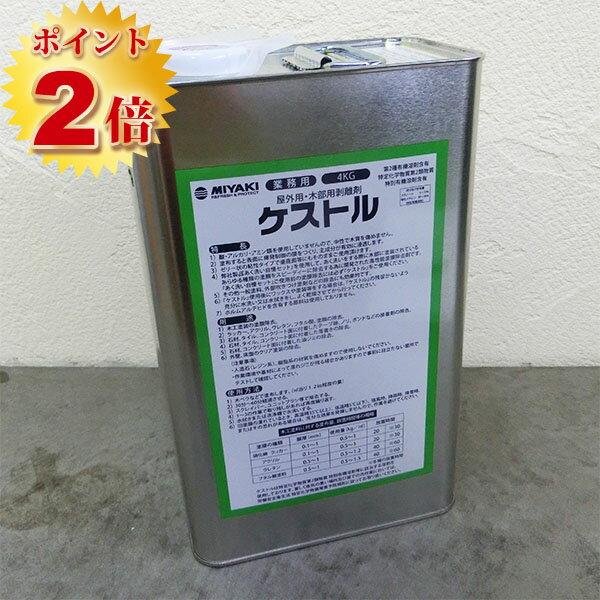 木材用剥離剤 「ケストル」 特長 ・浸透力が強いため、皮膚に触れると刺激がします。 ・塗布すると表面に揮発抑制の膜をつくり、主成分が有効に浸透します。 ・粘性ですので垂直面でも容易に必要量を塗布できます。 ・酸・アルカリ・アミン類は使用しておらず中性タイプですので木質を傷めません。大理石等デリケートな石材にも安心して使用できます。 ・ミヤキ商品を使用して木部のアク洗いをする際、木部に塗装されているあらゆる種類の塗装膜を、スピーディーに除去するために開発された高性能剥離剤です。 ミヤキ商品の使用効果を高めるために開発されたものであり、ミヤキ商品使用前の塗膜除去には、必ず「ケストル」をご使用ください。 市販の剥離剤等で除去しますと、木部表面を傷めることがあり、また、ミヤキ商品の効果は遅くなる可能性があります。 ・その他一般塗料・外壁吹き付け塗剤などの除去にも有効です。 木材用剥離剤 「ケストル」 使用方法 ・施工部分の充分な乾燥を確認してください。 ・木べら・ハケ・ローラー等でたっぷりと厚く(3〜4ミリ)塗布します。1当り1.2kg程度の量で、塗るというよりのせる感覚です。 ・夏場で最低30分、冬場で60分以上を目安に経過させる ・素材を傷つけないように、ヘラ(木製、ディルリンべラ)、スポンジ等で剥離した塗膜をケストルごと除去する。 ・水拭きまたは水洗いしてください。表面のヌメリが取れれば充分です。 ・乾燥後、確認してください。