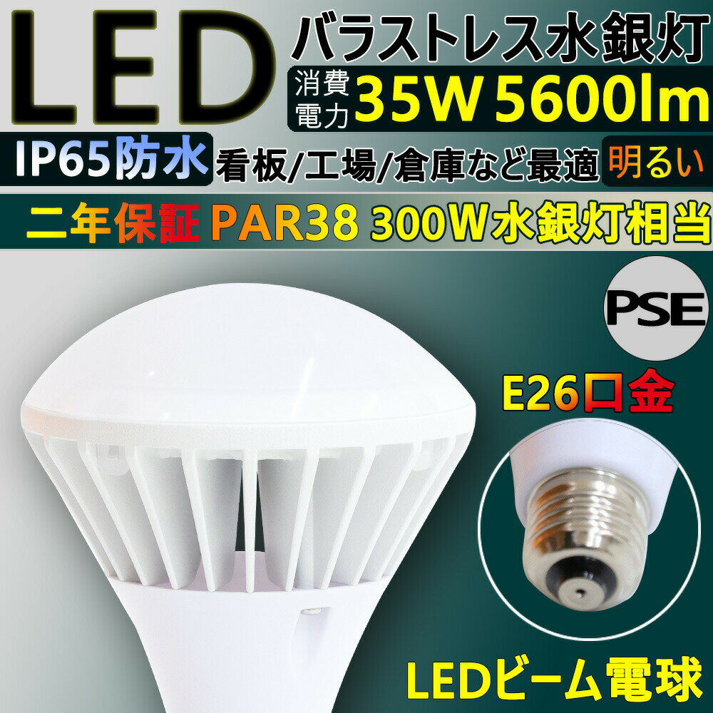 LED スポットライト led ビーム電球 LED電球 PAR38 E26 口金 消費電力35W 5600lm LED バラストレス水銀灯 300W相当 ハイビーム電球 レフ球 ビーム電球 水銀ランプ スポットライト 昼白色 昼光色 電球色 LED電球 スポット照明 ハロゲン ビームテック 看板照明 防雨 2年保証