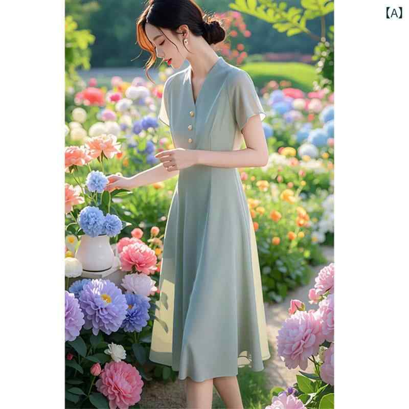 シフォン スカートきれいめ シンプルで 気前の 良い 感の 緑の v ネックは 腰の 薄手 糸の シフォンの ワンピースの 子 夏の レディース ロング スカートを 収めます。x2