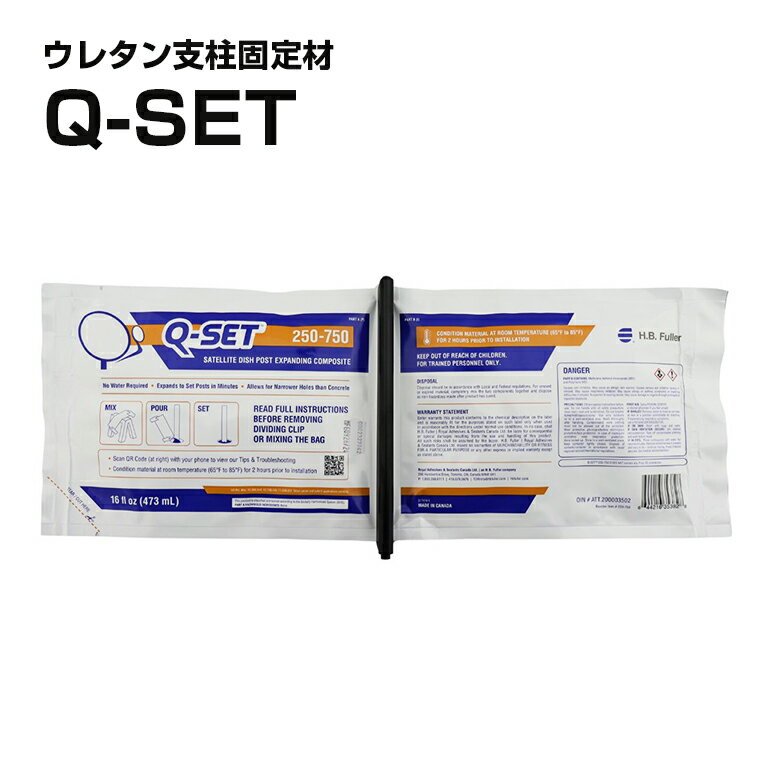 ウレタン支柱基礎材Q-SET 【基本説明】 ・作業労力の大幅削減。 Q-SETは、他に一切の資材を使いません。 これひとつで簡単に施工可能。 ・作業時間の短縮。 コンクリートに比べると、 「混合・注入・硬化」にかかる時間は 大幅削減。 ・優れた粘着性。 スチール製・亜鉛メッキ鋼製の支柱にも効果を発揮。 ・スチール製支柱の早期腐食リスクを軽減。Q-SETは電気絶縁体なので、早期腐食を防止。 ・高い疎水性。湿った土や、穴に少し残った溜まり水の影響は受けません。 【商品説明】 内容量:473ml/袋 【注意事項】 ・商品の案内をよく読んでからご使用下さい。 ・使用前に、はさみorカッター、保護用手袋、保護用めがねorゴーグルをご準備下さい。 ・使用前は、およそ20℃の室温下で最低1時間以上保管して下さい。保管した商品を混合後1分以内に袋を必ず開封して下さい。 ・本製品を用途以外には絶対に使用しないで下さい。 ※675mlから473mlに容量変更しております。(2024/5〜)