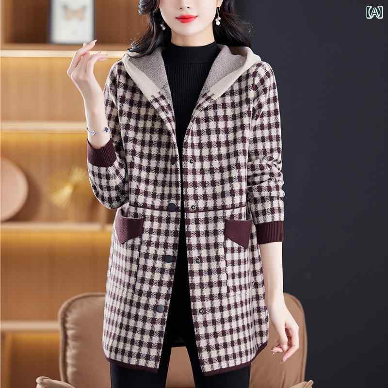 お母さん アウター コート レディース チェック おしゃれ ポケット カジュアル ニット 上品 ウール 秋冬 フード 大きめサイズ 防寒