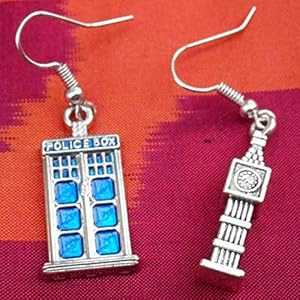 ブルー交番ターディスとビッグベン時計塔の非対称イヤリング、タイムトラベルオタクのフーヴィアンギフト Dreamscape Studio Blue Police Box Tardis and Big Ben Clock Tower Asymmetric Earrings, Time Travel Geek whovian Gift