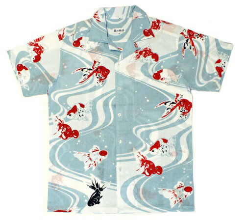 手ぬぐいアロハシャツ「江戸金魚づくし 水色」S・M・L・LLサイズ粋/快適/通気性/涼しい/クールビズ/エコ/父の日