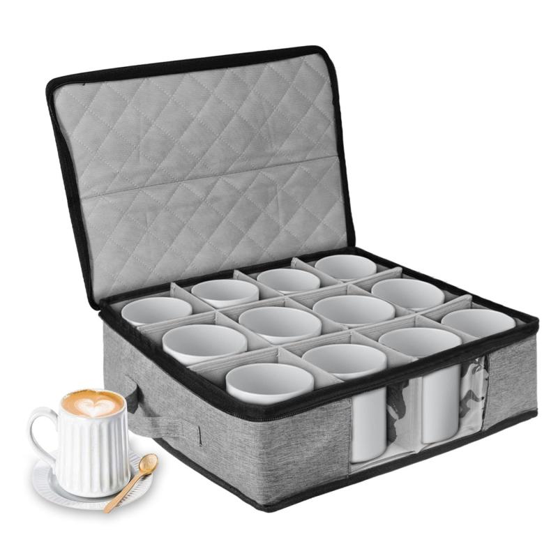 BOHEMIABYコーヒーカップオーガナイザー、仕切り付きマグカップボックス、丈夫なハンドル付きスタッキング可能なハードシェル磁器カップボックス、12個のマグカップまたはグラスを収納で