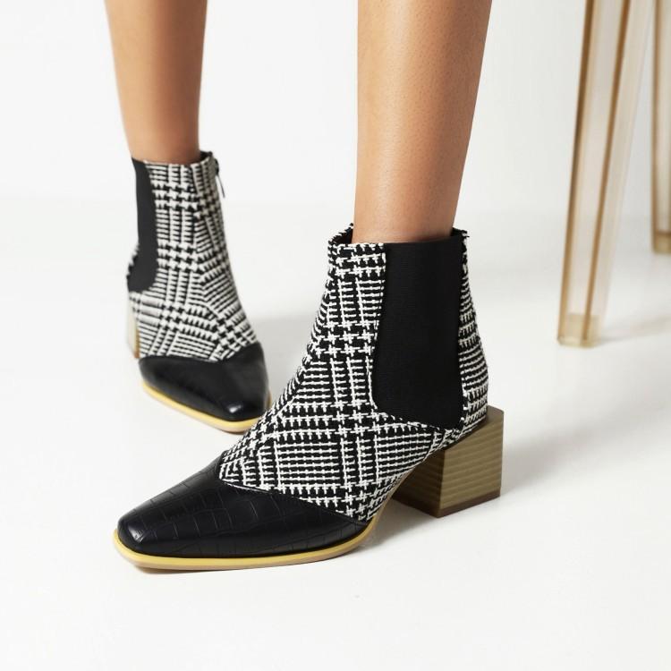 ショートブーツ レディース あったか 保温 ショートフェイクファー裏地 脚長効果 スタイルアップ サイドジップ 太ヒール チャンキーヒール スネーク柄 蛇柄 切り替え スクエアトゥ 欧米風 PUレザー ゴム底 春秋冬