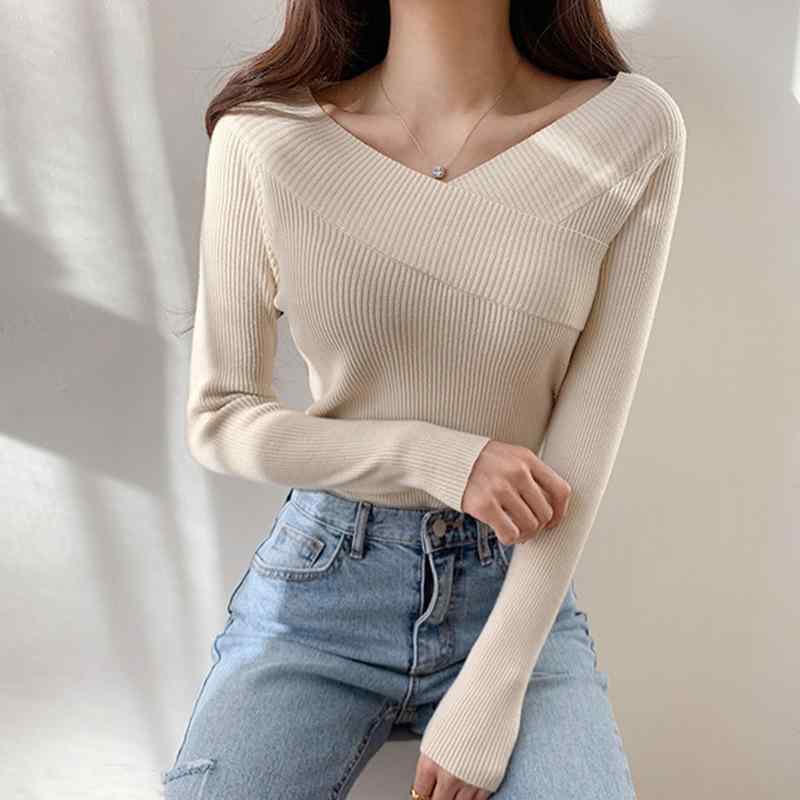 ニット レディース トップス 秋冬 Vネック 長袖 プルオーバー カットソー 無地 スリムフィット インナーウェア 白 黒 ベージュ 青 伸縮性 ストレッチ