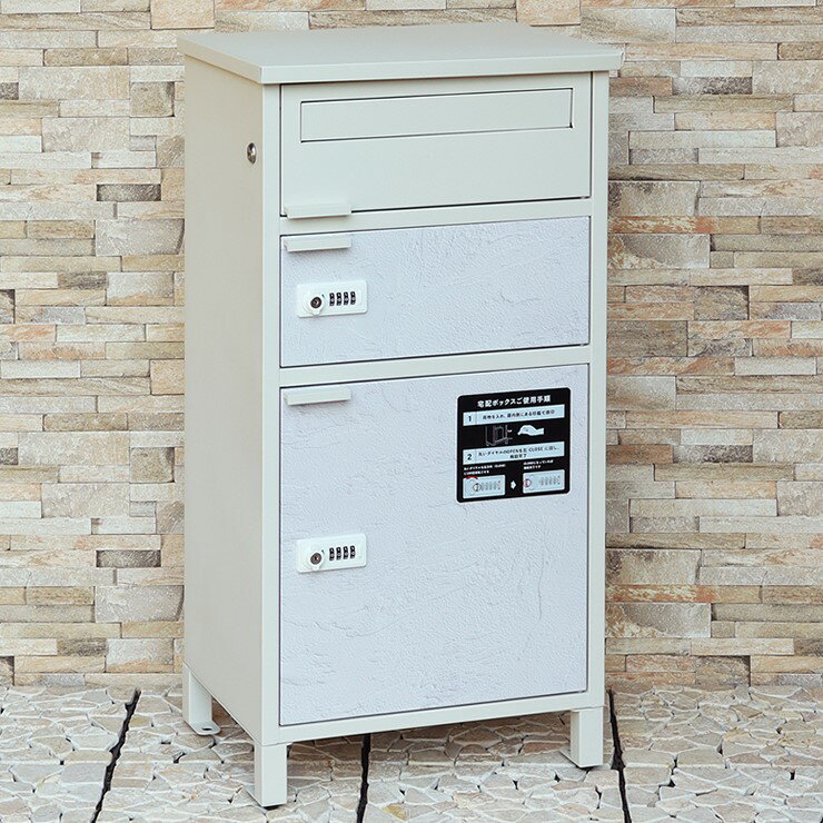 商品説明★ 郵便ポスト付宅配ボックス:1台の商品で、郵便ポストとしても、宅配ボックスとしても使用可能なアイテムです。★ セキュリティ:最上段は、シリンダー錠付きなので、防犯面に安心です。また、スペアキーが1本付属しております。★ セキュリティ:宅配上段・下段ともに、ダイヤルロックとシリンダー錠(ダイヤル解錠番号が分からなくなった際の緊急用)の組み合わせタイプの鍵を使用しております。★ ゼロリターンキー:宅配上段・下段のダイアルロックは、鍵を施錠した際、鍵を解錠した際にダイアル番号が「0000」にリセットされ、ダイヤル番号の漏洩の心配がありません。★ 大きな郵便物も投函可能:最上段の郵便投函口は、ゆうパケットポストや、ネコポスが投函可能です。★ キー(3段すべて)、アンカーボルト、キーフック付印鑑ケース、宅配業者用の配達マニュアル(マグネット式でお好きな場所に貼付け可)が付属しており、お客様で追加でご用意頂くものは特に必要なく、すぐにご使用頂けます。★ 2色展開:カラーは、明るいグレーのクールグレーと、くすんだベージュのグレージュの2色からお選び頂けます。★ 漆喰風シート:宅配上段、宅配下段扉にはホワイトの漆喰風シートを使用しており、特徴のある仕上がりとなっおります(漆喰風シートの為、表面の凹凸はありません)。★ 錆びにくい加工:ガルバナイズド処理を施しているため、錆びの発生がしにくい仕様となっております。★ 最上段収納:投函口サイズが、約W33.0×H3.2cmと大きなサイズ設計で、大きな郵便物も投函可能です。★ 宅配部収納:宅配上段の宅配可能最大サイズは、約W34.0×D31.0×H11.9cm。宅配下段の宅配可能最大サイズは、約34.0×D31.0×H35.4cmになります。★ 最上段宅配使用:印鑑ケースは3個付属しており、最上段も宅配ボックスとしての使用も可能です。※防水塗装は施しておりませんので、軒下や屋根がある場所への設置を推奨致します。スペック* サイズ/重量:W44×D35×H85(アジャスター込みサイズ)cm/15.8kg* 最上段:[投函口]約W33.0×H3.2cm、[取出口]約W35.6×D31.0×H14.3cm* 宅配上段:[取出口]約W34.0×D31.0×H11.9cm* 宅配下段:[取出口]約W34.0×D31.0×H35.4cm* 材質:金属(鉄) ガルバナイズド処理* 塗装:粉体塗装* 生産国:中国* 組立品(本体完成品・脚のみ取付)