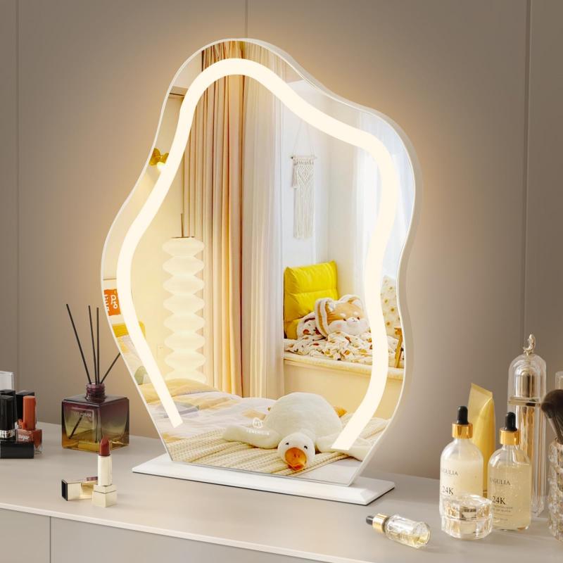 FENCHILIN 女優ミラー ハリウッドミラー 鏡 卓上 ライト付き 卓上ミラー 卓上鏡 化粧鏡 led ミラー 女優鏡 三色照明モード 無段階調光 10倍拡大鏡付き くも型高輝度LED雲のように囲むよう女優ミラー:女優鏡の周りを独特なクモ型(雲型)に囲むように配置されたLEDチューブライトが明るさがあるし、柔らかくてまぶしくないです。天候や場所の影響を受けずに、しっかりした明るさでメイクアップし、ハリウッドスターの気分で毎日を楽しめます。上半身を確認できるサイズで、スキンケアやヘアスタイル、服装の雰囲気の確認にも活躍です。3種類の調色モード・無段階調光:スマートなタッチパネルでワンタッチで、楽々、簡単操作できます。短押すと穏やかなウォームライト(電球色)と太陽光に近い自然なナチュラルライト(昼白色)と清々しい爽やかなクールライト(昼光色)3種類の調色モードを選択できます。長押しすると、明るさを無段階調整することができます。最大2000ルクス明るさ調節ができます。朝方・夜など暗い時間帯でも洗面所やトイレなど暗い場所でも、本当の自分を映し、ムラなく顔全体を均一に照らし、ナチュラルなメイクができます。(オフィスの明るさは約300ルクスで、テレビ放送のスタジオは約1000ルクスです。)こだわった細部:滑り止めマートも採用するので、耐久性に優れており、後ろに傾けても倒れません。10倍拡大鏡:吸盤式10倍拡大鏡が付き、毛穴の状態やアイラインのズレもチェックでき、肌の細やかい状況とスキンケアをしっかり把握します。視力が低下して見えづらい方に、メガネがなくてもメイクできます、メイクも便利です。卓上に置くだけで、明るく清潔な雰囲気を作り出し、どんなお部屋にも馴染みやすいです。世界中の女性の夢と憧れが詰まったハリウッドミラーは、自分へのご褒美はもちろん、誕生日、記念日、母の日、クリスマス、新年や引越しなどのお祝い、大切な人へのものにもピッタリです。