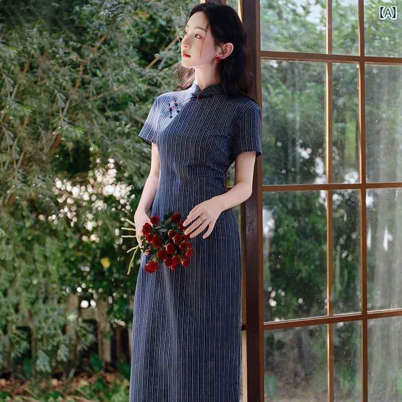 ドレス チャイナ レディース 知的な チャイナ ドレスの 若見え チャイナ風 長い 縦縞の 教師の 服装 民族 風の スーツ