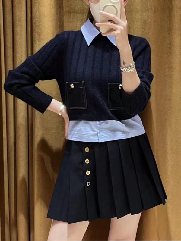 ニット レディース S家 法式 切り替え 配色 POLOネック プルオーバー トップス レーヨン 長袖 薄手 紺色 名媛風