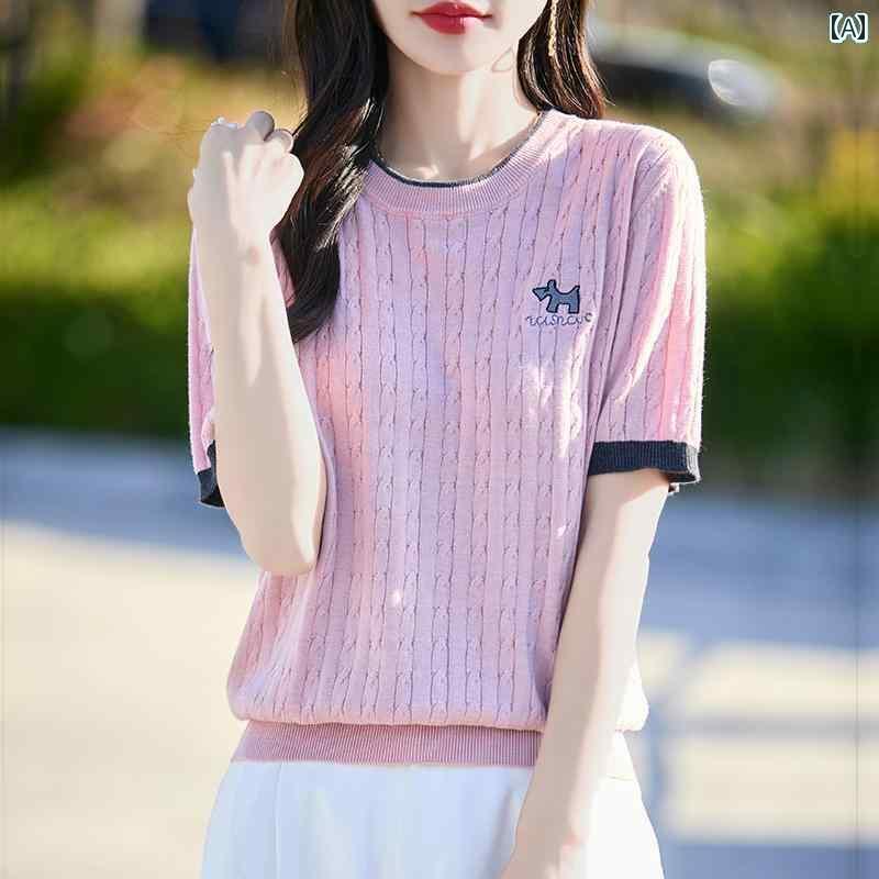 サマーニット レディース の 糸 刺繍 半袖 Tシャツ レディース 夏 2025 ベース シャツ スタイリッシュな 大きいサイズ レディースニット トップス