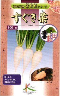 1.本種は京都賀茂地区で昔から栽培されている 蕪の一つである。 2.草勢強く、生育旺盛である。草丈は70〜 80cmまで伸長する。 3.葉は濃緑色で欠刻がなく、根部は円錐状を なして、品質はよい。とくに肉質は軟らかく 特有の芳香、風味がある。 4.すぐき菜は間引菜として最高の菜類であり、 まくり菜的栽培も行われ、漬物、煮物に 珍重される。すぐき漬には豊富な乳酸菌が 含まれガンやウイルス病の予防になる。