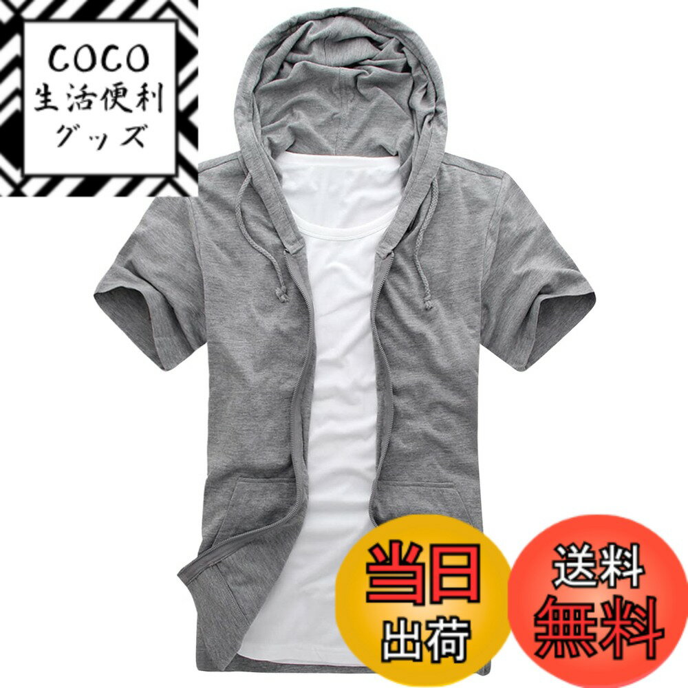 【送料無料】[EASTEMPO] パーカー メンズ 半袖 夏 薄手 ジップアップ ゆったり 大きいサイズ 色:グレー、サイズ:2XL