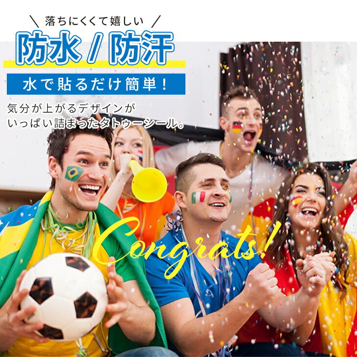商品情報総数2枚セット(同国2種)現品お求めの際はお気軽にお問合せください。イラン/ウェールズ/ウルグアイ/エクアドル/カタール/カメルーン/ガーナ/クロアチアコスタリカ/コロンビア/スウェーデン/スイス/セネガル/セルビア/ポーランド/モロッコ/ロシア※ご使用のモニターや照明などにより色味に多少違いが生じる可能性がございます。使い方1)肌の貼りたい部分を清潔にし、乾かしておきます。2)使いたい絵を切り取り、プリント面を下にしてお肌に貼ります。3)湿らせた布やスポンジでシールの台紙全体を湿らせます。4)15〜20秒ほど待ってから、台紙を慎重に剥がします。5)しっかり乾いたら完成♪剥がし方クレンジングオイルやベビーオイル、消毒用エタノールをコットンに含ませ、タトゥーの上に置いて10〜20秒ほど待ってからやさしくこするときれいに剥がれます。※汗や皮脂、体毛の上からは貼ることができません。※アクセサリーや衣類による摩耗にご注意ください。国旗 タトゥーシール タトゥー シール 国旗シール フェイスシール 防水 国旗 シール 2枚セット 防水 大会応援グッズ イベント お祭り サッカー 野球 ワールドカップ フェイスシール 応援フェイスシール 耐水 ステッカー 世界 応援 リーグ 世界カップ 応援タトゥーシール 2枚セット 【総数】2枚セット(同国2種)【現品】選択肢オプションからお選びください。日本/アメリカ/アルゼンチン/イギリス/イタリア/イングランド/インド/オーストラリアオランダ/カナダ/韓国/スペイン/中国/デンマーク/ドイツ/ブラジル/フランス/ベルギーポルトガル/メキシコ【お取り寄せ品】お求めの際はお気軽にお問合せください。イラン/ウェールズ/ウルグアイ/エクアドル/カタール/カメルーン/ガーナ/クロアチアコスタリカ/コロンビア/スウェーデン/スイス/セネガル/セルビア/ポーランド/モロッコ/ロシア※ご使用のモニターや照明などにより色味に多少違いが生じる可能性がございます。 2枚セットでお得♪ 種類豊富な国旗の中から選べる♪ 水で貼るだけで簡単♪ 応援をより楽しみたい方 簡単に使える国旗タトゥーシールをお探しの方 家族でイベントを楽しみたい方 イベントで貼って楽しい水で貼るタイプのタトゥーシールです。【使い方】1)肌の貼りたい部分を清潔にし、乾かしておきます。2)使いたい絵を切り取り、プリント面を下にしてお肌に貼ります。3)湿らせた布やスポンジでシールの台紙全体を湿らせます。4)15〜20秒ほど待ってから、台紙を慎重に剥がします。5)しっかり乾いたら完成♪【剥がし方】クレンジングオイルやベビーオイル、消毒用エタノールをコットンに含ませ、タトゥーの上に置いて10〜20秒ほど待ってからやさしくこするときれいに剥がれます。※汗や皮脂、体毛の上からは貼ることができません。※アクセサリーや衣類による摩耗にご注意ください。 【即納】翌営業日に発送いたします。 1