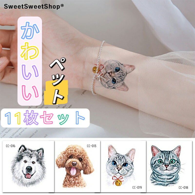 【11枚セット】タトゥーシール 犬 猫 柴犬 フェイクタトゥー ヨークシャーカラフル ボディステッカー ファッション ボディーシール ボディーペイント かわいい おしゃれ 動物 いぬ ねこ シンプル イベント 大人 子供 インスタ映え