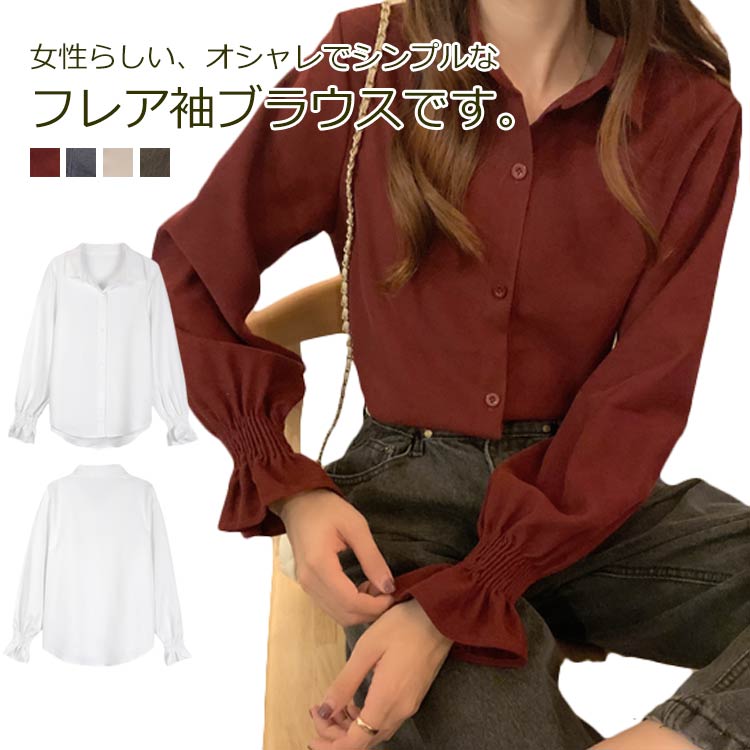 シャツ ブラウス 長袖 フレア袖 トップス レディース レトロ風 オフィス おしゃれ ゆったり 体型カバー キレイめ エレガント OL