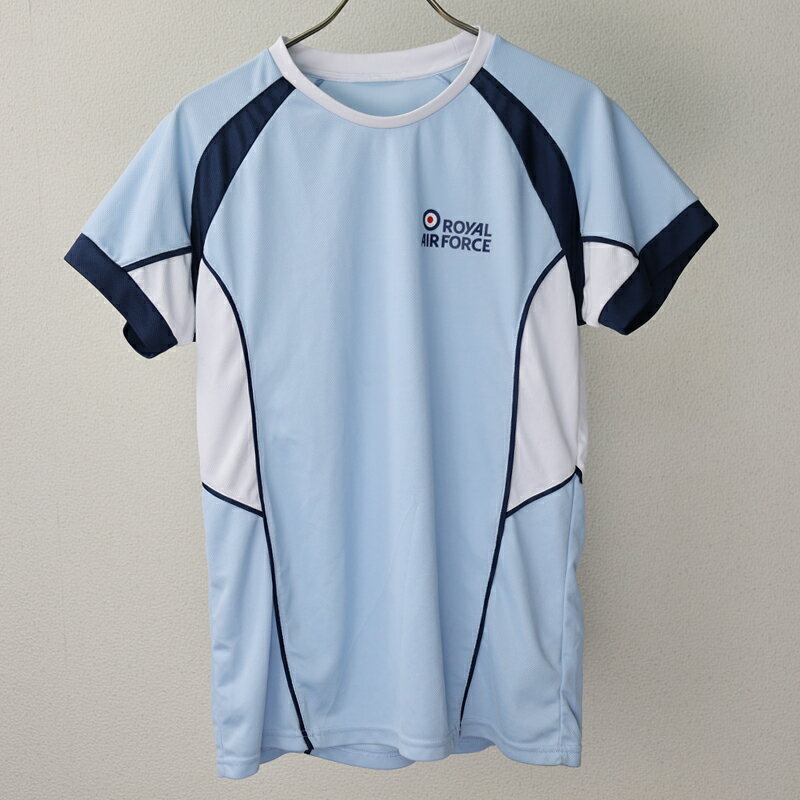イギリス軍. ROYAL AIRFORCE スポーツTシャツ《実物・USED》 UK イギリス 空軍 本物 フィジカル PT 運動 ドライ 速乾 軍モノ ブルー 青 メンズ 男性用 エスアンドグラフ