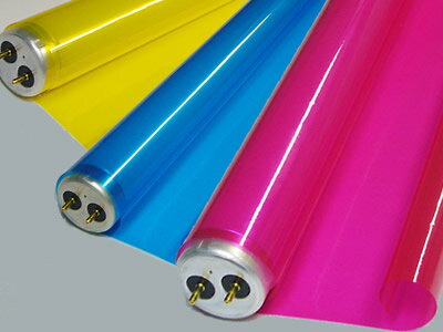 「ルミネカラー」は、通常使用されている「普通蛍光灯」に巻き付けるだけでカラー蛍光灯に変えることのできる、蛍光管用カラーフィルムです。 「ルミネカラー」は形状記憶加工によって、カール状になっており蛍光管に簡単に巻き付けれます。取付、取り外しが簡単にできますので、一般的なイベントの照明、雰囲気づくりなどのカラー照明に手間がかりません。 サイズは、200mm×1195mm、200mm方向にカールさせています。 箱のサイズは、30本まで、100×100×1230(mm)です。 「ルミネカラー」は豊富なカラーバリエーションで、イベント会場・ゲームセンター・パチンコ店などアミューズメント施設の楽しいカラー照明を演出できます。 「ルミネカラー」は明るすぎて困る所の、調光用フィルムター・常夜灯用フィルターとしてご利用いただけます。 「ルミネカラー」はハサミで簡単にカットできます。また、カッターで切り抜きもできます。 蛍光管の大きさやデザインにあわせてカットしてください。 いろんなカラーを組み合わせて、カラフルな蛍光灯を楽しんでいただけます。