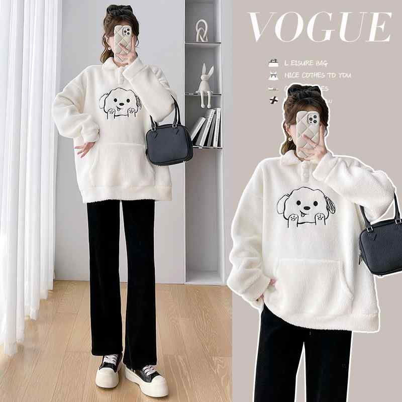 トレーナー レディース 秋冬 妊婦服 マタニティ トップス 長袖 カットソー ゆったり 羊羔毛 ラムウール風 高襟 アニメ柄 漫画風 カジュアル オフホワイト