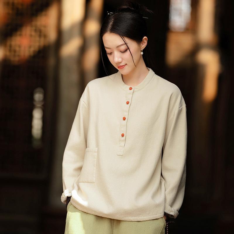 Tシャツ レディース 秋冬 綿麻 立襟 新中式スタイル 切り替え 厚手 裏起毛 トップス 麻色 草緑 焦糖 黒 ピンク系 ゆったりサイズ 文芸復古
