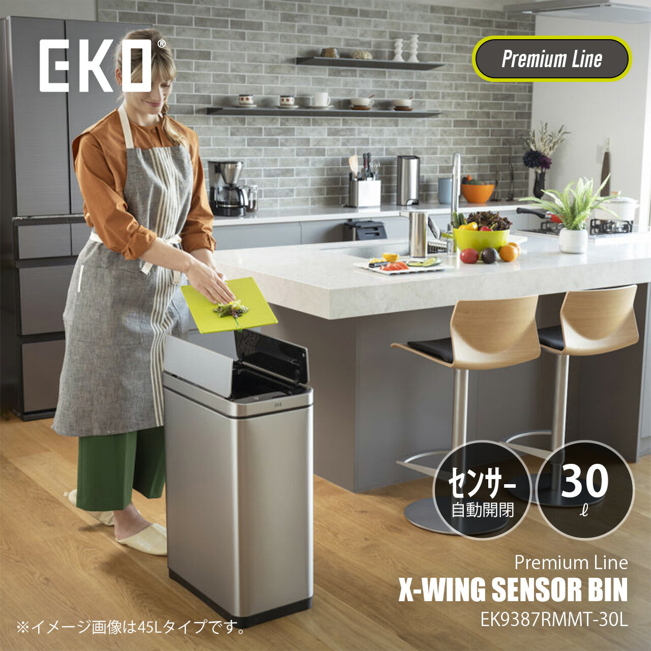 about EKO 1997年に中国・広州で設立されたEKOは現在、世界中の消費者に向け、ステンレスゴミ箱を年間1,000万台生産するグローバルなメーカーへと発展しました。 EKOの創業者であるジェームス チェンは、ゴミ箱という存在を皆様の家庭に合ったデザイナー性の高い品質に変えたいと考えています。彼はこのような情熱をもってゴミ箱に対する意識を変え、その思想を今日のEKOに反映しています。 常により良いものを追求し、生活環境と美しいスタイル、最先端技術、そして使いやすさを製品に取り入れることを常に意識した製品作りを行っているメーカーです。 その結果20年間で、EKOの製品は高級品市場にも浸透し、その価値を知られるようになりました。 ゴミ箱の他、センサーミラー、ソープディスペンサー、キッチンアイテム等、家庭用品に至るまで幅広く展開しています。開く時の高さを抑えた両開きの充電式センサーゴミ箱 手をかざすだけで静音でフタが開閉。開閉時の騒音レベルは図書館内と同程度の約40dB。充電式でコンセント不要です。コードをつないで充電しながらでも使用できます。 30Lはやや大きめで、ごみが多くでるキッチンでの使用におすすめ。蓋はステンレス製でオフィスや仕事部屋に置いてもスタイリッシュです。 手をかざすと自動で開くアクティブセンサーを搭載。前を通っただけでは開かない高性能センサーを採用、無駄な開閉がなく電池も長持ちします。 フタは5秒後に自動で静かに閉じます。閉じるまでの残り時間はディスプレイのカウントダウンタイマーが教えてくれます。 センサーの範囲内に手かものをかざしておくと、センサー検知がなくなるまで開きっぱなしになります。 タッチスイッチで手動開閉もできます。OPENボタンに触れると蓋が開きCLOSEボタンを押すまで開けっぱなしにすることができます。 パネル上方15〜25cm以内に物体を検知するとフタが開きます。テーブルの下などに置く場合はフタが開きっぱなしになることがあります。その際はセンサースイッチでセンサー機能を止めて手動モードでの開閉のみに設定できます。 電源スイッチが蓋の側面にあるので、取り外さなくてもON/OFFができます。 インナーボックスは汚れたら取り外して洗え、清潔に使えます。ゴミ袋をぴったりフィットさせることができる便利なバッグフィクサー付き。 エックスウィング センサービンは45Lと30Lの2サイズ展開 EKO エックスウィングシリーズ 品名 エックスウィング センサービン 30L カラー ダークステンレス EK9387RMMT-30L サイズ 約幅25×奥行37.5×高さ61.9cm(蓋開口時の高さ:72cm) 容量 30L 重量 5.7kg 材質 ステンレススチール,ポリプロピレン,ABS樹脂 電源 リチウムイオン電池(USB充電式) 充電口:タイプC ブランド EKO 生産国 中国 保証期間 製造元保証1年間 備考 ○ ACアダプタは付属していません。 ○ ゴミ箱の上に物を置かないでください。 ○ 開いているフタは無理やり閉めないでください。