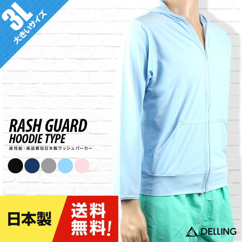 DELLING 日本製 ラッシュガード ラッシュパーカー メンズ 長袖 大きいサイズ 3L パーカー フード付 ジップアップ ZIPラッシュパーカー ゆったり シンプル 無地 体型カバー 水着 日焼け防止 UVカット 紫外線対策 速乾