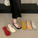 サンダル レディース 革 フラット ストラップ ビーチ ぺたんこ ローヒール スクエアトゥ 無地 春夏 イエロー シルバー レッド ブラック