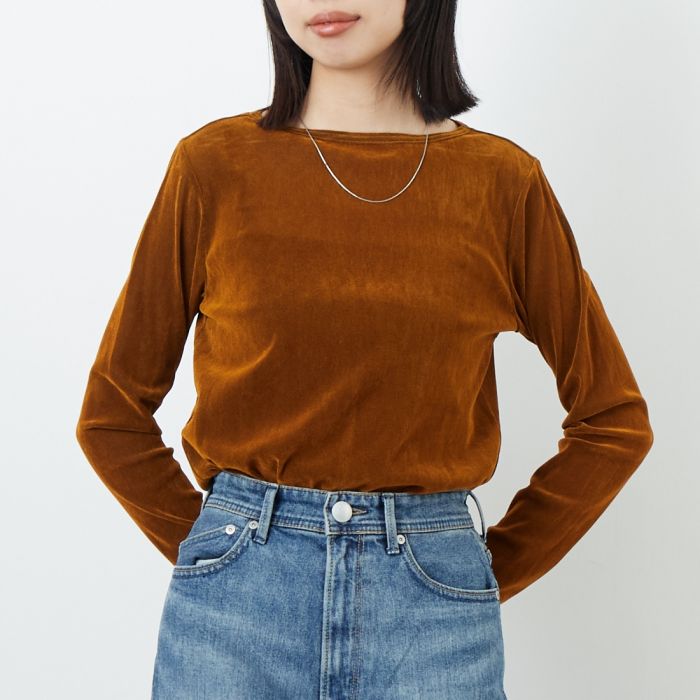 SHOPPING GUIDE ※ご購入前に必ずご確認ください※ 当店では複数店舗で在庫を共有しており、システムで在庫調整を行っておりますがタイミングにより在庫にずれが生じることがあります。 人気商品など注文が集中してしまうと在庫数更新が間に合わず、ご注文頂いた商品が欠品となる場合もございます。 万が一品切れの場合は誠に申し訳ございませんが 何卒、ご容赦の程お願い申し上げます。 (弊店より必ずご連絡させていただきます。) 送料と商品のお届けについて 商品の返品、交換について お支払いについて 商品在庫について メーカー希望小売価格はメーカー商品タグに基づいて掲載していますしなやかなナイロンチュールにレーヨンのフロッキー加工を施し、上品な光沢と深みのある色合いを表現したボートネックTシャツ。滑らかな肌触りと軽やかな着心地が特徴で、身体のラインを美しく引き立てます。程よく開いたボートネックが首元をすっきりと見せ、シンプルながらも洗練された印象に。秋冬はジャケットやカーディガンのインナーとして、春先は一枚でさらりと着こなせる万能アイテムです。ロングスカートやワイドパンツと合わせたエレガントなコーディネートはもちろん、デニムとのカジュアルミックスもおすすめ。光沢感のある素材が、シンプルなボトムスも華やかに引き立て、デイリーから特別なシーンまで幅広く活躍します。 素材基布 ナイロン 100% フロッキー部分 レーヨン 100%生産国日本 表記着丈身幅袖丈肩幅F62cm46cm61cm35cm ※JEANS FACTORY Online Shop独自の方法により採寸しております。採寸方法はサイズガイドをご確認ください。