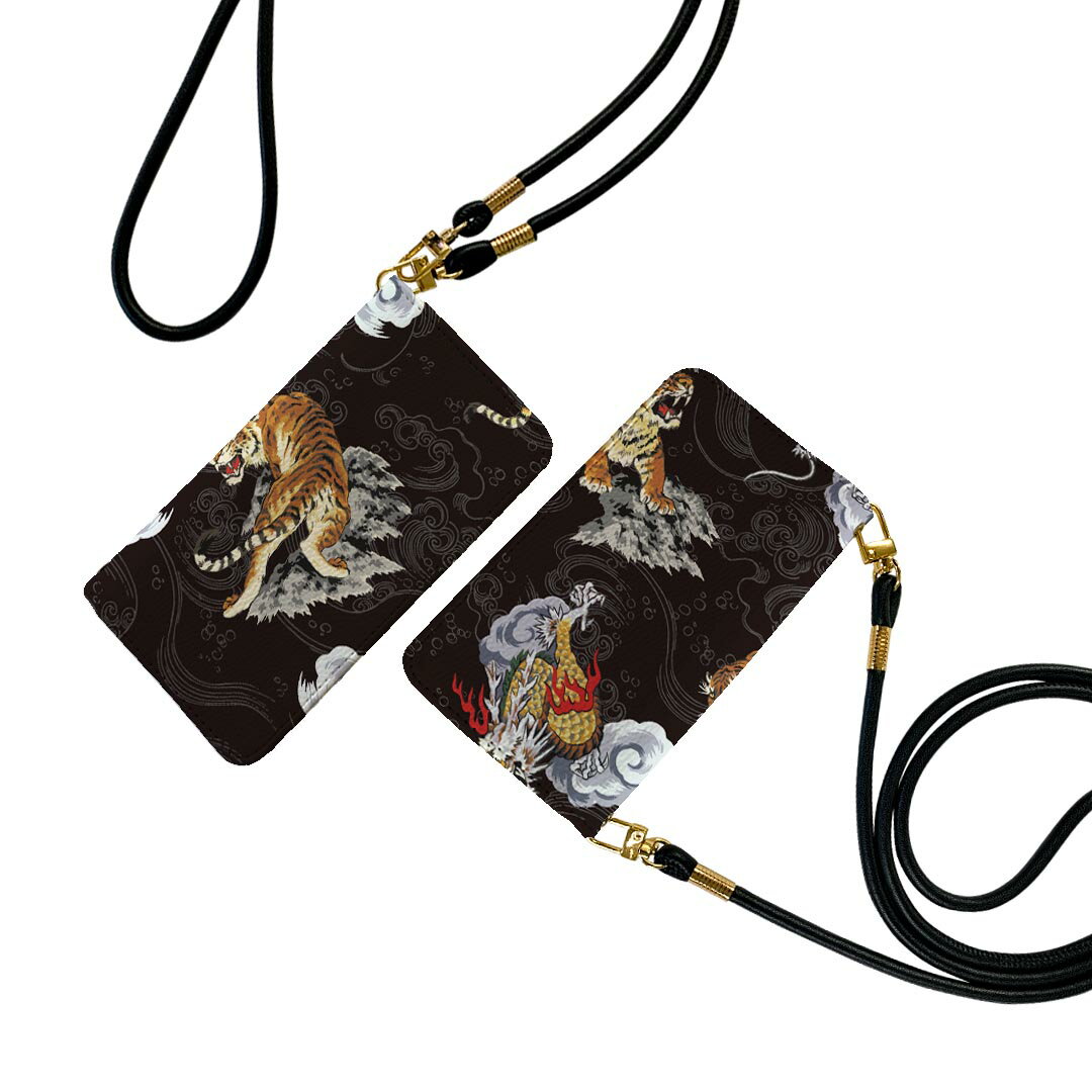 iPhone15plus 6.7 インチ 専用 各キャリア iPhone 15 plus 共通対応 ストラップ付き ケース ショルダー スマホ 落下防止 手帳型 マグネット式 ピタッと閉まる スマホカバー 肩掛け 斜めかけ 008675 日本語・和柄 和風 和柄 虎 龍 黒 ブラック