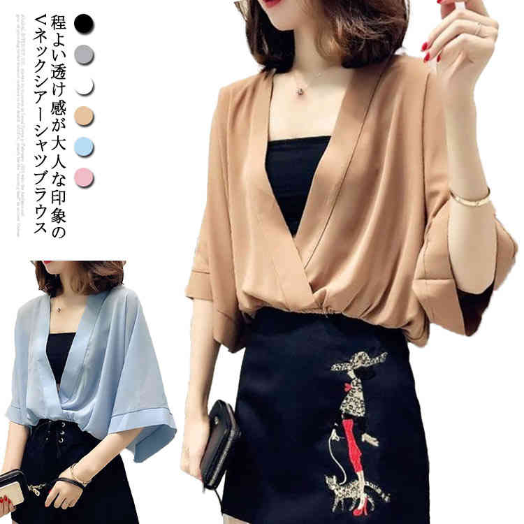 ブラウス ドルマンスリーブ シフォン 韓国 通勤 5分袖 Vネック レディース シャツ 30代 無地 通学 大人 ゆったり カジュアルシャツ 体型カバー 五分袖 きれいめ かわいい 20代 40代 シアーシャツ