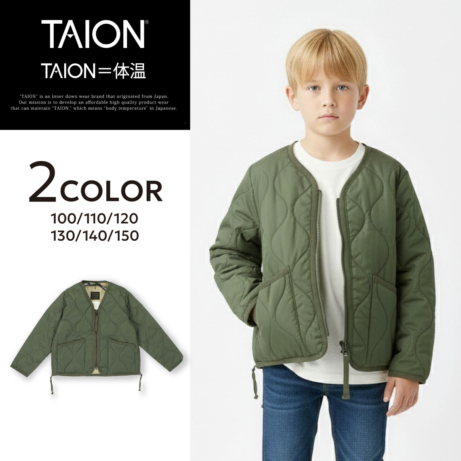 【最大1000円OFFクーポン発行中】 タイオン TAION インナーダウン ベスト ジレ アウター 子供服 ミリタリー Vネックジップ キッズ MILITARY V-NECK ZIP ブラック オリーブ 黒 TAION-K001ZML-1
