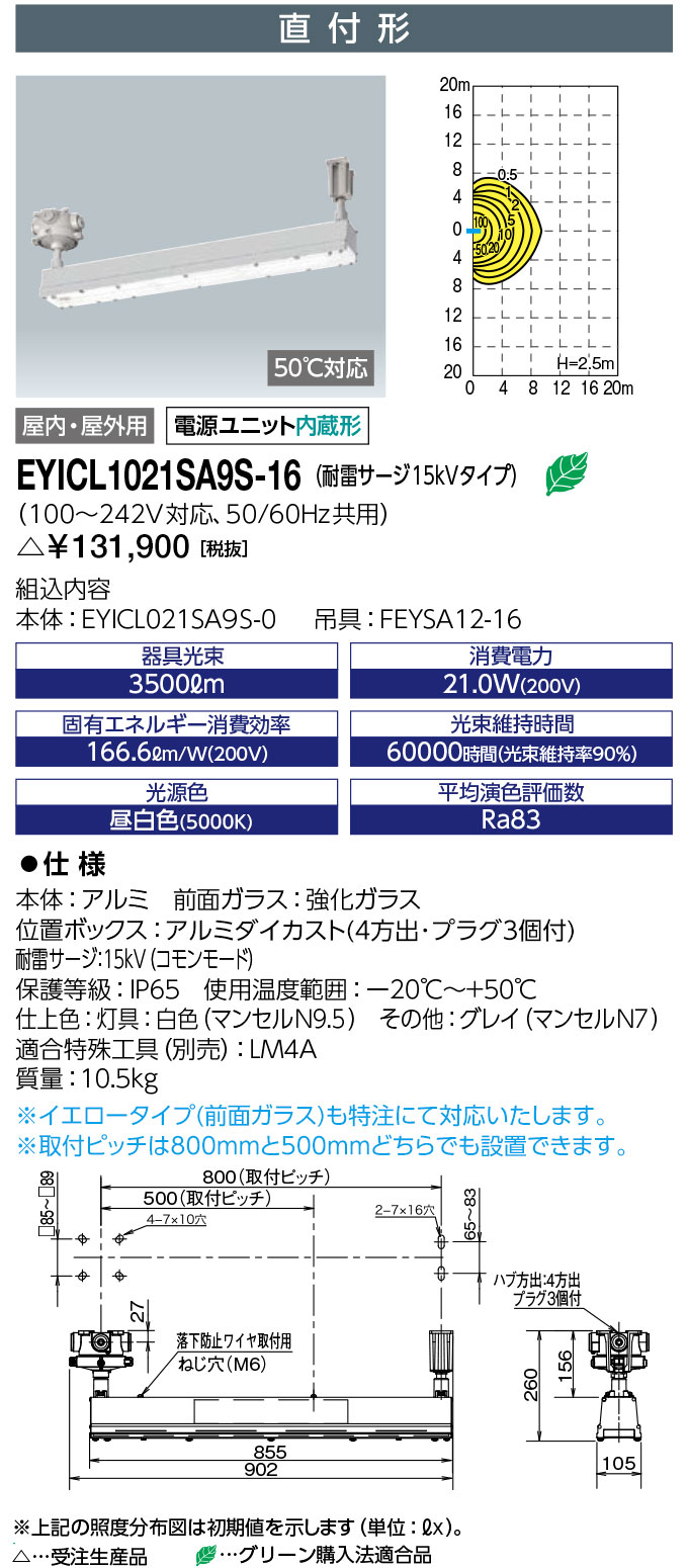 LEDioc EX VONO (レディオック EX ヴォーノ) 安全増防爆形LED照明器具 〈蛍光灯代替品〉 Hf32W×1灯用(高出力形)相当 パイプ吊形 ハブ寸法16 標準タイプ 屋内・屋外用,電源ユニット内蔵形,水素ガス対応,50℃対応 IEC規格整合品 ※イエロータイプ(前面ガラス)も特注にて対応致します。 仕様 定格光束(器具光束) :3500lm 消費電力(200V):21.0W 固有エネルギー消費効率(200V):166.6lm/W LEDモジュール寿命:60000時間(光束維持率90%) 光源色:5000K相当(昼白色タイプ) 平均演色評価数:Ra83 入力電圧:100~242V対応 周波数:50/60Hz共用 耐雷サージ:4kV(コモンモード) 保護等級:IP65 使用温度範囲:-20℃~+50℃ 本体:アルミ 前面ガラス:強化ガラス 位置ボックス:アルミダイカスト 仕上色:灯具:白色(マンセルN9.5)、その他:グレイ(マンセルN7) 質量:10.4kg EYICL2021SA9-16は以下の商品を含んでいます 本体:EYICL021SA9-0 パイプ吊具:FEYSA22-16 アクセサリ 落下防止ワイヤ:EXSWR01-L870 ガード:EYICLG02 特殊工具:LM4A
