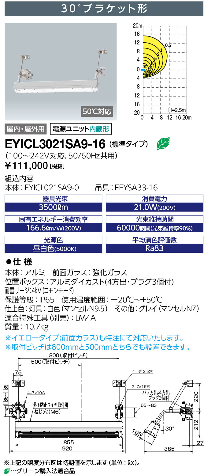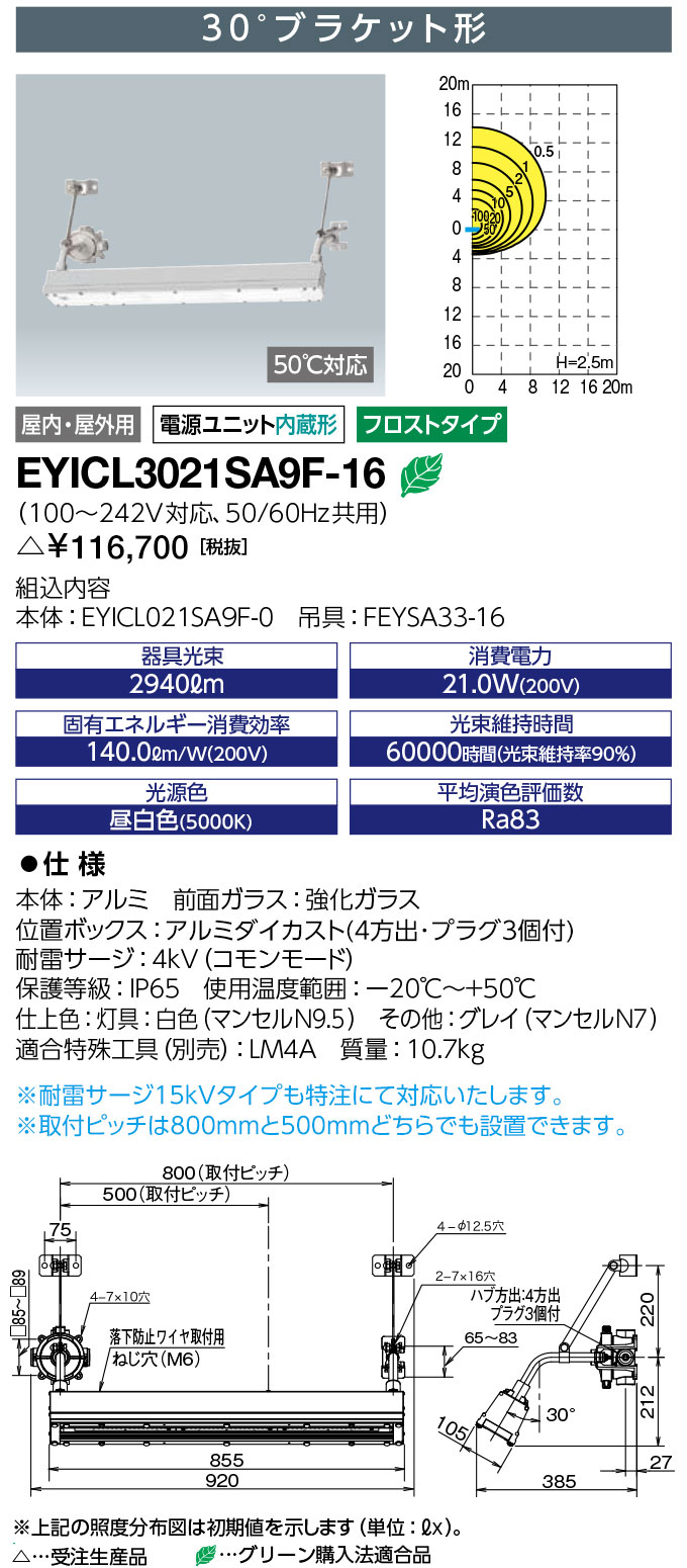 LEDioc EX VONO (レディオック EX ヴォーノ) 安全増防爆形LED照明器具 〈蛍光灯代替品〉 Hf32W×1灯用(高出力形)相当 30°ブラケット形 ハブ寸法16 フロストタイプ 受注生産品 屋内・屋外用,電源ユニット内蔵形,水素ガス対応,50℃対応 IEC規格整合品 ※耐雷サージ15kVタイプも特注にて対応致します。 仕様 定格光束(器具光束) :2940lm 消費電力(200V):21.0W 固有エネルギー消費効率(200V):140.0lm/W LEDモジュール寿命:60000時間(光束維持率90%) 光源色:5000K相当(昼白色タイプ) 平均演色評価数:Ra83 入力電圧:100~242V対応 周波数:50/60Hz共用 耐雷サージ:4kV(コモンモード) 保護等級:IP65 使用温度範囲:-20℃~+50℃ 本体:アルミ 前面ガラス:強化ガラス 位置ボックス:アルミダイカスト 仕上色:灯具:白色(マンセルN9.5)、その他:グレイ(マンセルN7) 質量:10.7kg EYICL3021SA9F-16は以下の商品を含んでいます 本体:EYICL021SA9F-0 30°ブラケット吊具:FEYSA33-16 アクセサリ 落下防止ワイヤ:EXSWR01-L870 ガード:EYICLG02 特殊工具:LM4A