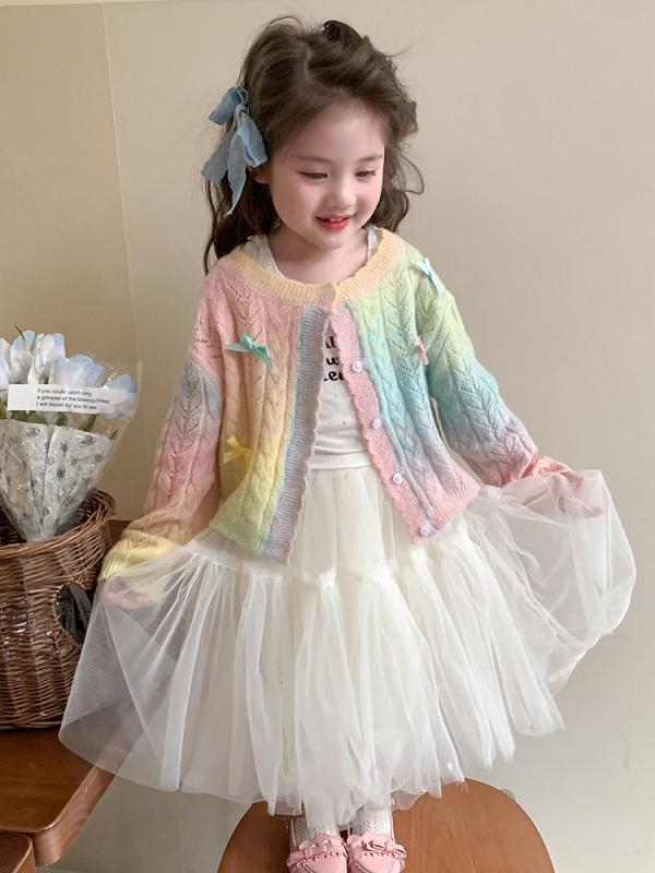 ニットカーディガン キッズ 女の子 春秋 レインボー カラフル 長袖 ボタン付き クルーネック 韓国風 肌触り 柔らか おしゃれ 普段着 ポリエステル素材 100cm 140cm