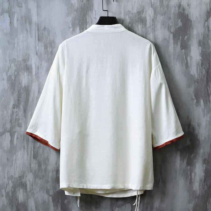 シャツ メンズ 男性用 チャイナ風 龍 刺繡 麻 リネン 七分袖 トップス 唐装 漢服風 デザイン 立襟 ショートスリーブ ルームウェア