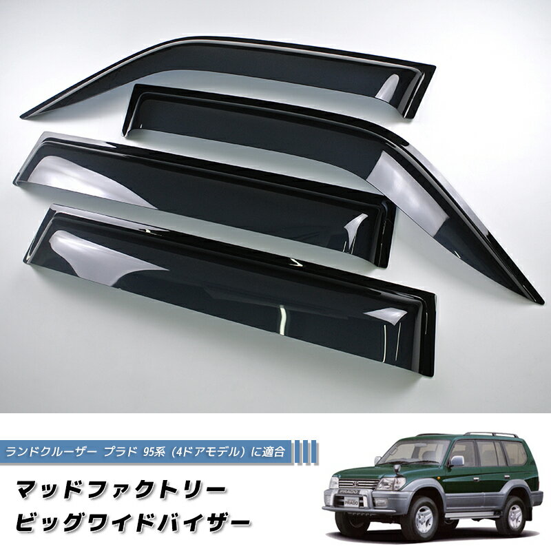 【先着2名様】 装着写真を送ってもらえる、半額キャッシュバック・モデルカーキャンペーン開催中! (ご希望の方はご購入前に当店まで一度ご連絡ください。) ★ あんしん取付保証 ★ 初心者の方や、女性でも大丈夫! 取付に失敗した時はメールでご連絡いただければ、両面テープを無償にてお送りいたします。 幅がワイドで厚みは2.5mmと頑丈な設定!車内の換気に最適!雨の日も窓を開けたまま換気OK。日焼け対策にも効果的です。 ランドクルーザー プラド 95ビッグワイドバイザー 【マッドファクトリーオリジナルプロダクト】 もう純正では入手困難なプラド90/95系(3ドア、4ドアモデル)のワイドバイザーがマッドファクトリーより復刻! 【適合車種】トヨタランドクルーザー プラド 95系 4ドアモデル (1996-2002)全てのランクル プラド 95系 4ドアモデルに適合KDJ95W KZJ95W RZJ95W VZJ95W VX95 【カラー】ダークスモーク 【機能・詳細】 ・車検対応品で安心 ・一点ずつ実車のドアでフィッティング確認済み ・写真付きの取扱説明書で、簡単に取り付け可能 ・ドットグラデーションで、外側から両面テープが見えないよう仕上げています ・日東社製ハイパージョイント両面テープを使用(自動車メーカー純正採用品) ・住友アクリル(厚さ2.5mm)を使用(純正よりしっかり) ・日差しをカットし、日焼け防止にも効果的 ・空気抵抗を減らし、風切り音を軽減 ・冬の窓枠のラバーの凍結防止にも役立ちます ・バラ売り対応可(破損時はご連絡ください) 【セット内容】フロント用(L.R) リア用(L.R) 取り付けマニュアル 【取付方法】両面テープのみでの簡単装着 取付金具は使用しません。 【梱包サイズ】160サイズ 【ランドクルーザー プラド 95関連の商品リスト】 ビッグワイドバイザー(3ドア用/ダークスモーク) ビッグワイドバイザー(前後セット/ダークスモーク) ビッグワイドバイザー(3ドア用/ライトスモーク) ビッグワイドバイザー(前後セット/ライトスモーク) スーパーワイドバイザー(3ドア用/ライトスモーク) スーパーワイドバイザー(前後セット/ライトスモーク)幅がワイドで厚みは2.5mmと頑丈な設定!車内の換気に最適!雨の日も窓を開けたまま換気OK。日焼け対策にも効果的です。 ★ あんしん取付保証 ★ 初心者の方や、女性でも大丈夫! 取付に失敗した時はメールでご連絡いただければ、両面テープを無償にてお送りいたします。 ランドクルーザー プラド 95 ビッグワイドバイザー 【マッドファクトリーオリジナルプロダクト】もう純正では入手困難なプラド90/95系(3ドア、4ドアモデル)のワイドバイザーがマッドファクトリーより復刻!【適合車種】 【カラー】ダークスモーク【仕様】・車検対応品で安心 ・一点ずつ実車のドアでフィッティング確認済み ・写真付きの取扱説明書で、簡単に取り付け可能 ・ドットグラデーションで、外側から両面テープが見えないよう仕上げています ・日東社製ハイパージョイント両面テープを使用(自動車メーカー純正採用品) ・住友アクリル(厚さ2.5mm)を使用(純正よりしっかり) ・日差しをカットし、日焼け防止にも効果的 ・空気抵抗を減らし、風切り音を軽減 ・冬の窓枠のラバーの凍結防止にも役立ちます ・バラ売り対応可(破損時はご連絡ください) 【セット内容】フロント用(L.R) リア用(L.R) 取り付けマニュアル 【取付方法】両面テープのみでの簡単装着 取付金具は使用しません。【梱包サイズ】160サイズ