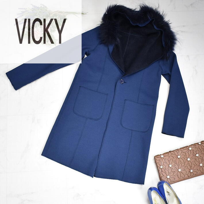 \定価から50%OFF/VICKY ロングコート 2304-46605 レディース キャリアブランド 【大】ブルーフォックス ファー付き リバーシブル フード付きコート ネイビー 濃紺色 ビッキー 半額