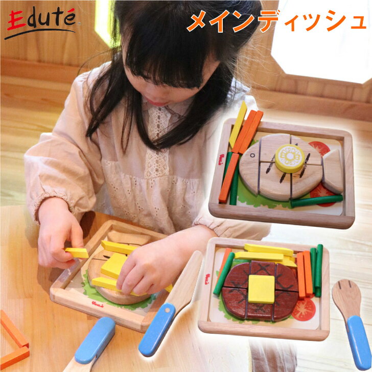 商品情報内容フレーム×1、フォーク×1、ナイフ×1、魚用台紙×1、ステーキパーツ×6、魚パーツ×6、フライポテト×4、いんげん×4、にんじん×4、バター×1、レモン×1サイズ箱サイズ:高3.7×幅22.5×奥28cm商品サイズ:高1.5×幅13×奥16cm重量:400g素材ゴムの木、MDF、ナイロン、紙対象年齢3歳〜注意事項※輸入商品について木目が目立つ、節が目立つ、傷、小さな黒点、線のような跡、接着剤のはみだし、色むら、縫製が粗い、縫製が整っていない、折り目やシワがあるような場合でも海外基準では不良商品にならないため、当店でも不良品扱いにはできません。このような理由での返品交換を承ることができかねます。手作りの木製品の特性をご理解いただいたうえでご購入をご検討ください。※この商品は当店実店舗でも販売しております。在庫数の更新は随時行っておりますが、お買い上げいただいた商品が、品切れになってしまうこともございます。その場合、お客様には必ず連絡をいたしますが、万が一入荷予定がない場合は、キャンセルさせていただく場合もございますことをあらかじめご了承ください。Edute メインディッシュ 木のおもちゃ おままごと ままごとセット ごっこ遊び 木製 1歳 2歳 3歳 4歳 男の子 女の子 誕生日 プレゼント ギフト 玩具 知育玩具 食器 ボリューム満点でおままごとが楽しくなっちゃう! ごっこ遊びに興味を持ち始めたら、おすすめの木のおもちゃです! ステーキと魚の2種類のメインディッシュセットのおままごとの木のおもちゃ。付け合せにポテトやいんげん、ニンジン、バター、レモンとボリュームたっぷりに遊べます。ステーキと魚はナイフを使って6つにカットすることが可能です。■Voila(ボイラ) ボイラの木のおもちゃは、子ども達の想像力を育み、心身の成長を促す事を目的にデザインされています。 1981年設立以来、国内外で数々の賞を受賞しています。 1
