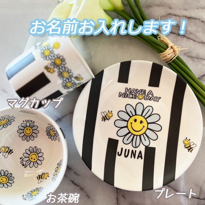名入れ可能 プレートご飯茶碗 マグカップにこちゃんスマイル花柄モノクロ 食器 プレゼント 結婚祝い入籍祝い入籍記念日 出産祝い 誕生日 セット 贈り物 お祝いプチプラ プチギフト