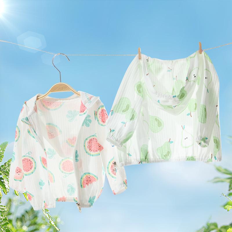 ・対象性別: ユニセックス・主な素材: 綿100%・デザイン: フード付き・機能: 通気性・対象年齢: 1〜3歳 (80〜100cm)・カラー展開: トロピカルパイン、サマースイカ、ペアホワイト、ハッピーオレンジ、ランティアンマンゴスチン・サイズ展開: 73cm、80cm、90cm、100cm、110cm、120cm